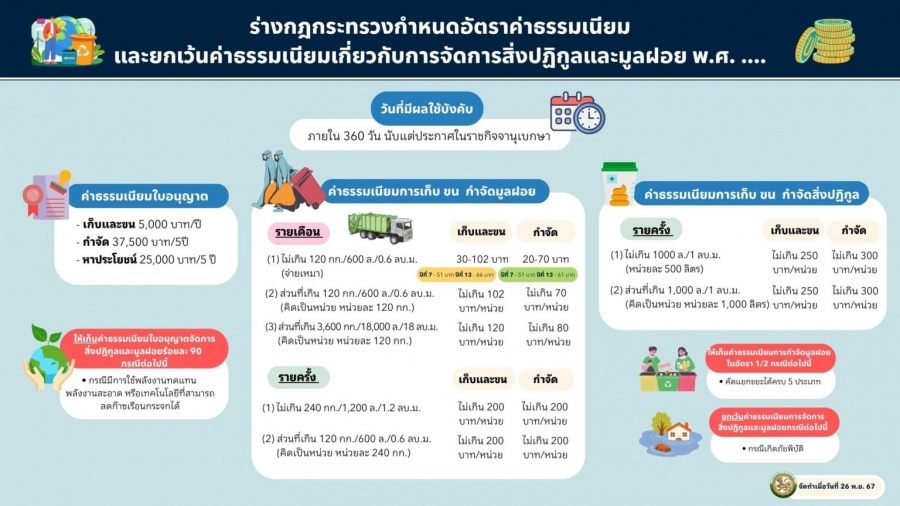 "กฎกระทรวงกำหนดอัตราค่าธรรมเนียมและยกเว้นค่าธรรมเนียมเกี่ยวกับการจัดการสิ่งปฏิกูลและมูลฝอย พ.ศ. 2567 " กระทรวงมหาดไทยได้มีหนังสือแจ้งว่ากฎกระทรวงกำหนดอัตราค่าธรรมเนียมและยกเว้นค่าธรรมเนียมเกี่ยวกับการจัดการสิ่งปฏิกูลและมูลฝอย พ.ศ. 2567 ได้ประกาศในราชกิจจานุเบกษา เล่มที่ 141 ตอนที่ 71 ก เมื่อวันที่ 22 พฤศจิกายน 2567 และมีผลใช้บังคับตั้งแต่วันที่ 17 พฤศจิกายน 2568 เป็นต้นไป มีสาระสำคัญ ดังนี้ (ปัจจุบันได้ขยายการบังคับใช้เริ่มในวันที่ 19 พ.ย.2569 )