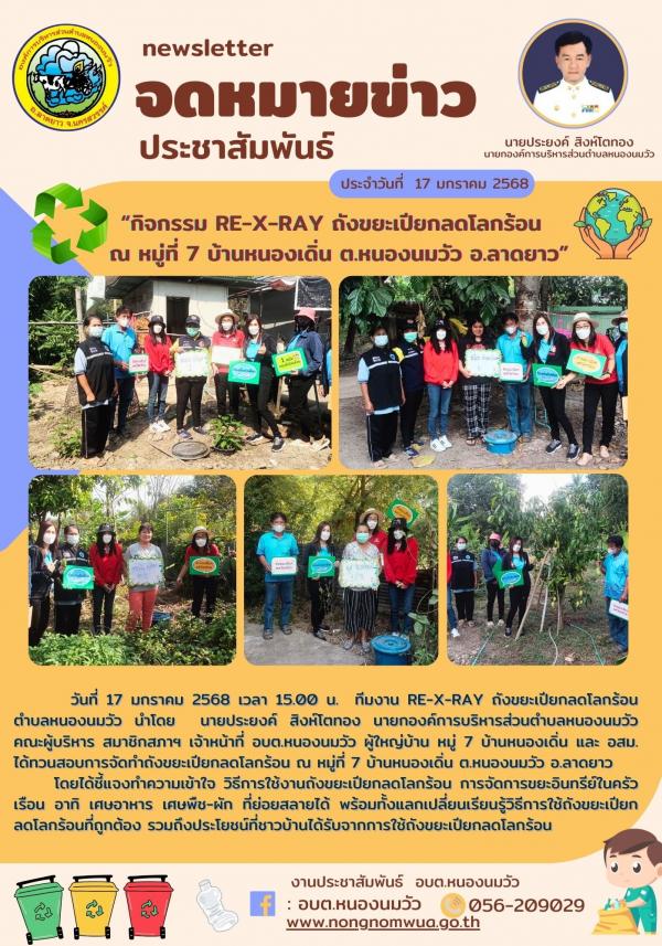 วันที่ 17 มกราคม 2568 เวลา 15.00 น. ทีมงาน RE-X-RAY ถังขยะเปียกลดโลกร้อน ตำบลหนองนมวัว นำโดย นายประยงค์ สิงห์โตทอง นายกองค์การบริหารส่วนตำบลหนองนมวัว คณะผู้บริหาร สมาชิกสภาฯ เจ้าหน้าที่ อบต.หนองนมวัว ผู้ใหญ่บ้าน หมู่ 7 บ้านหนองเดิ่น และ อสม. ได้ทวนสอบการจัดทำถังขยะเปียกลดโลกร้อน ณ หมู่ที่ 7 บ้านหนองเดิ่น ต.หนองนมวัว อ.ลาดยาว โดยได้ชี้แจงทำความเข้าใจ วิธีการใช้งานถังขยะเปียกลดโลกร้อน การจัดการขยะอินทรีย์ในครัวเรือน อาทิ เศษอาหาร เศษพืช-ผัก ที่ย่อยสลายได้ พร้อมทั้งแลกเปลี่ยนเรียนรู้วิธีการใช้ถังขยะเปียกลดโลกร้อนที่ถูกต้อง รวมถึงประโยชน์ที่ชาวบ้านได้รับจากการใช้ถังขยะเปียกลดโลกร้อน
