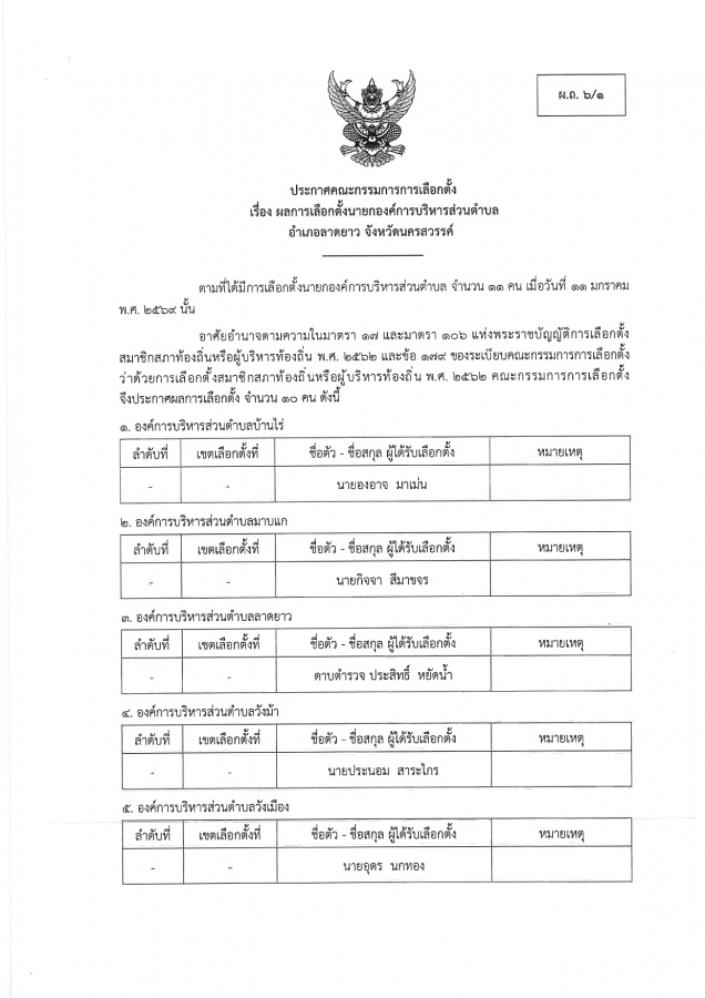 ประกาศคณะกรรมการการเลือกตั้ง เรื่อง ผลการเลือกตั้งนายกองค์การบริหารส่วนตำบลหนองนมวัว อำเภอลาดยาว จังหวัดนครสวรรค์